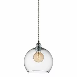 Rowan pendant from EBB & FLOW. The Rowan pendant lamp is produced in mouth-blown glass, combined with brass metal fitting and 2m twisted gold fabric wire and gold metal ceiling rose. Rowan is wonderful in its simplicity but gets an extra lift if you hang several together. This lamp must be fitted by a qualified electrician (contains earth wiring).