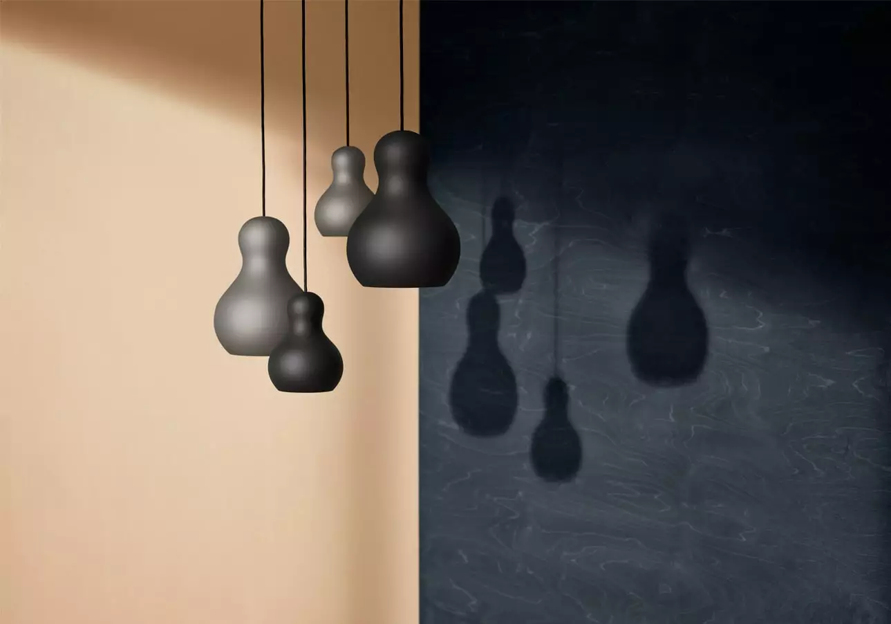Calabash P2 Pendant lamp from Fritz Hansen is a beautiful and soft lamp with a lovely light. Its shape is a sculpture in itself and it is beautiful even when not turned on. Hang them in a group above a coffee table or just one in a smaller hallway. The colours Meteor Black / Gray have more texture in their finish than the others. Available in several designs.