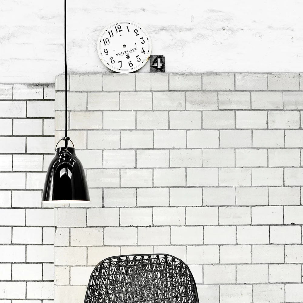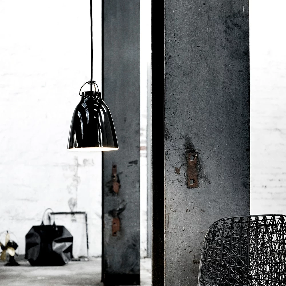 The lamp is made of steel covered with a smooth high-gloss paint. Caravaggio has an opening at the top of the screen that illuminates both the textile cord and hanger. Caravaggio is characterized by direct glare-free light. This edition has a black screen, cable, suspension and black canopy.