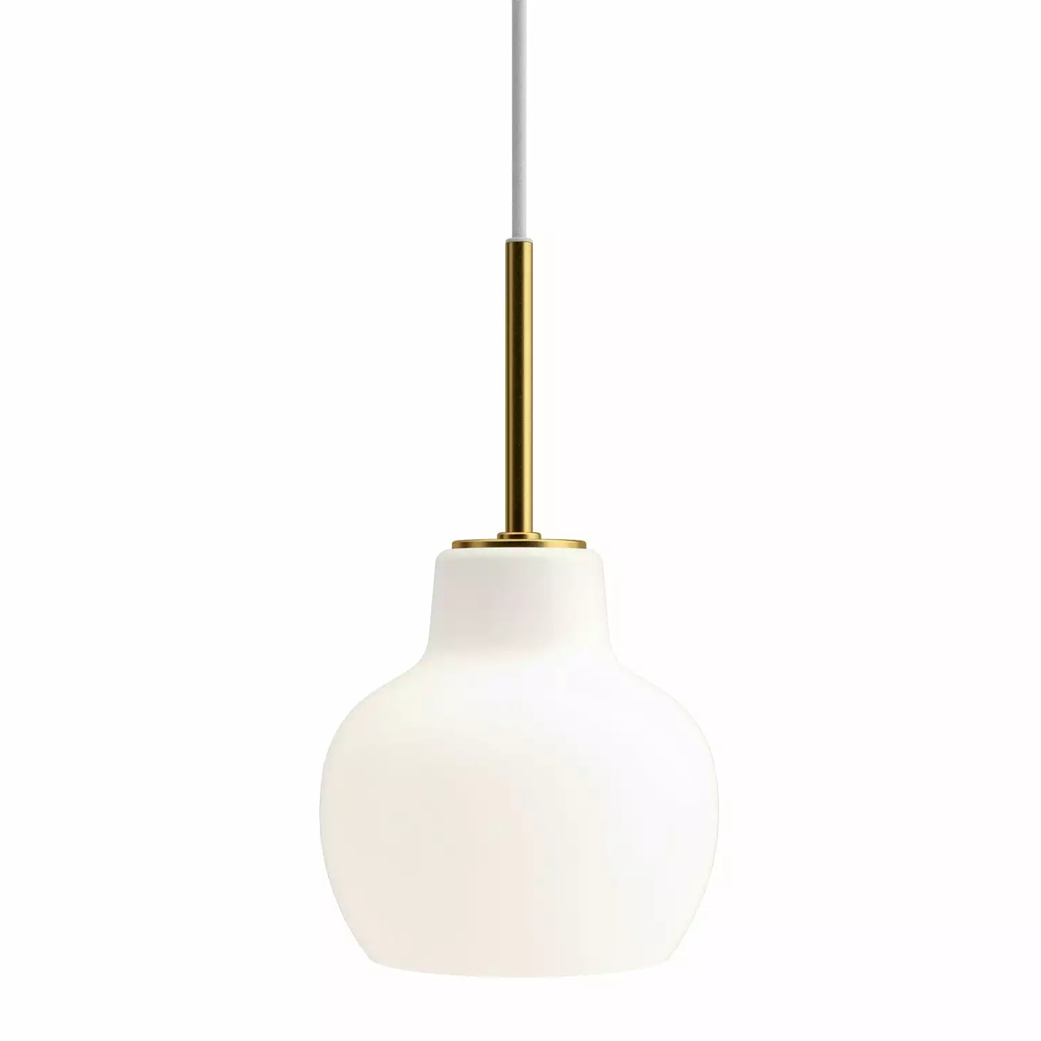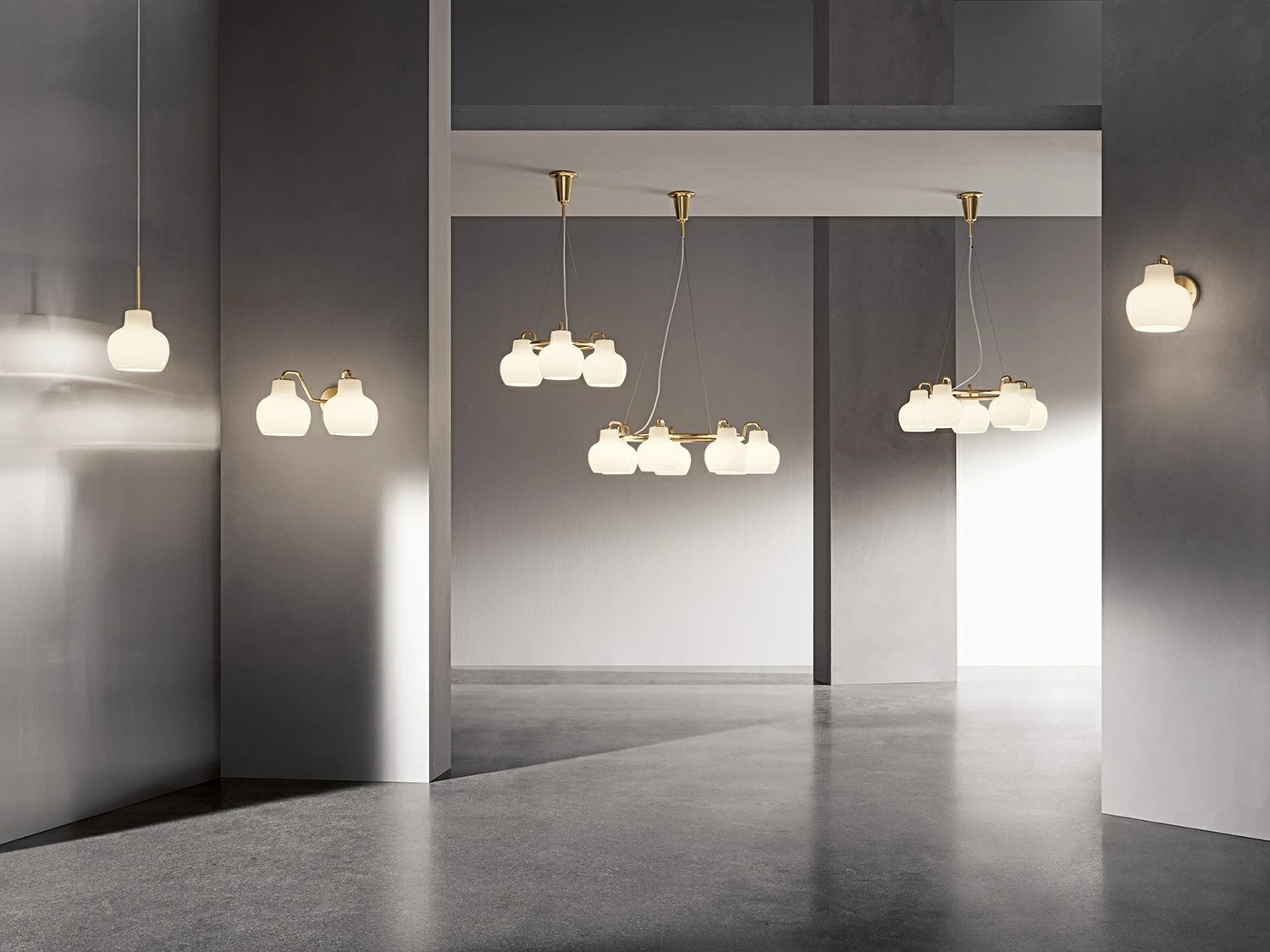 VL Ring Crown was designed in 1940 by Vilhelm Lauritzen for Louis Poulsen. In 2019 it was relaunched in a new vintage where both design and material selection are the same as in the original. The lamp is made of untreated, polished brass with a screen in white mouthblown opal glass in three layers. This beautiful luminaire is available with one, three, five and seven screens. This series creates a lovely feeling and illuminates a room and its interior with a warm and comfortable glow.