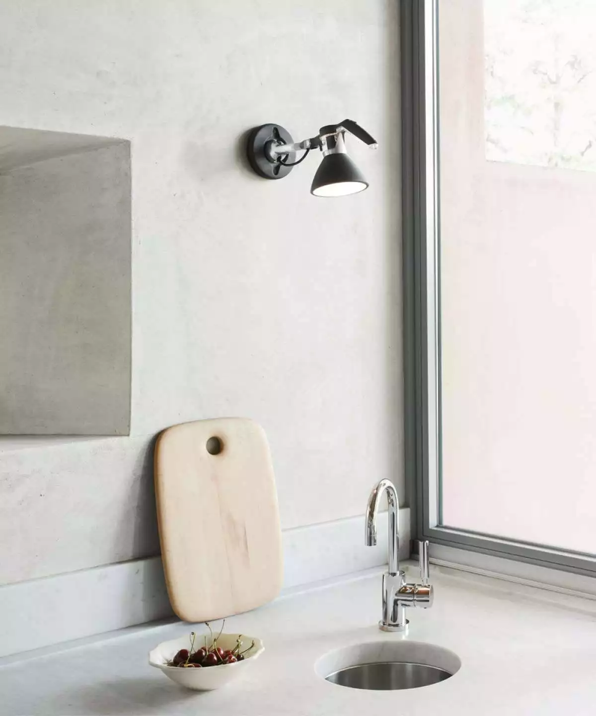 Fortebraccio Spot is a timeless wall lamp with architectural feel from Luceplan. The lamp has a distinct handle that allows you to easily adjust the light to the desired position. The Fortebraccio lamp is functional and can be used as a wall or ceiling lamp thanks to its intelligent design. It is made of polycarbonate and equipped with a switch. Available in two sizes and three colors white, black and aluminium.
