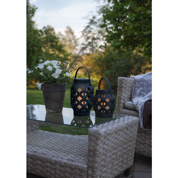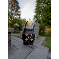 Lyhdyssä Star Trading-tuotemerkiltä on klassinen muotoilu muovista liekehtivällä liekillä sisällä ja kodikkaan kesäiltatunnelman luomiseen täydellisesti sopivalla sisäänrakennetulla ajastimella.