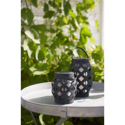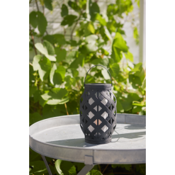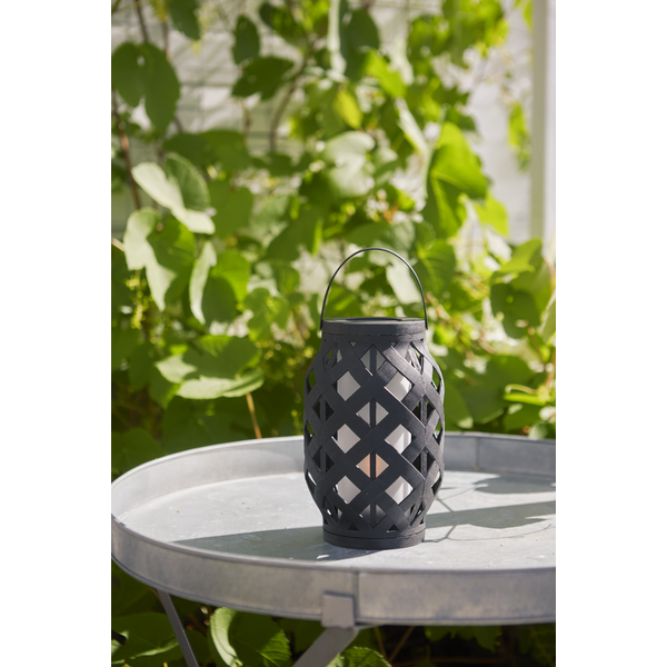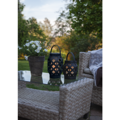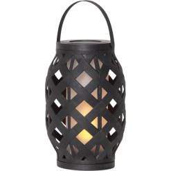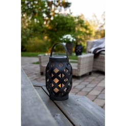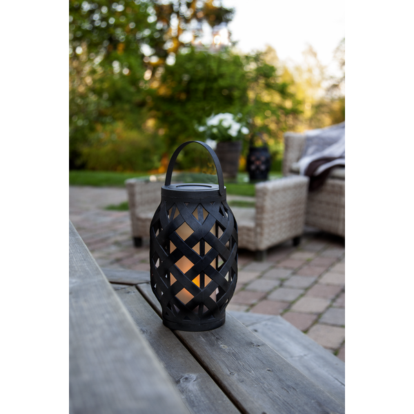 Lyhdyssä Star Trading-tuotemerkiltä on klassinen muotoilu muovista liekehtivällä liekillä sisällä ja kodikkaan kesäiltatunnelman luomiseen täydellisesti sopivalla sisäänrakennetulla ajastimella.